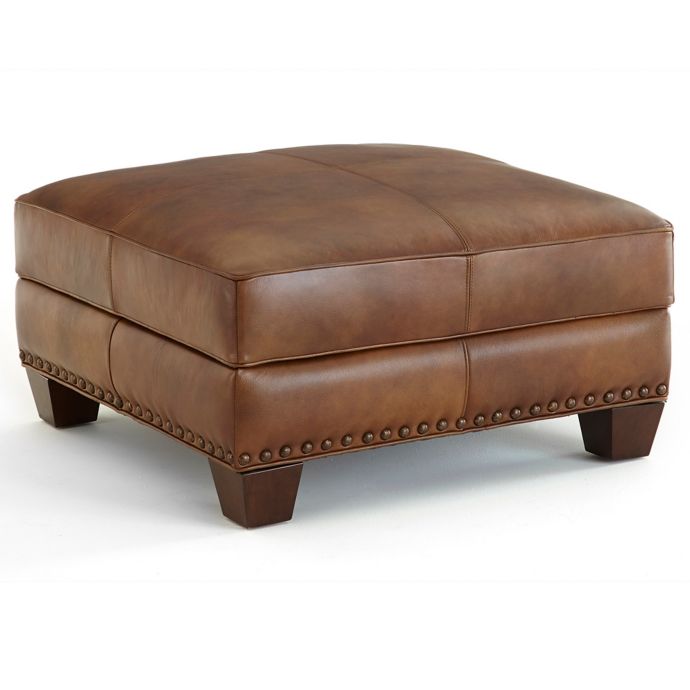 Harmon designer style leather ottoman with antique brass base nailhead trim measures w25 x d21 x h18.5. this beautifully traditional leather chair features architectural square tapered feet for the perfect amount of sophistication and style, and its arched back is designed to blend well.
